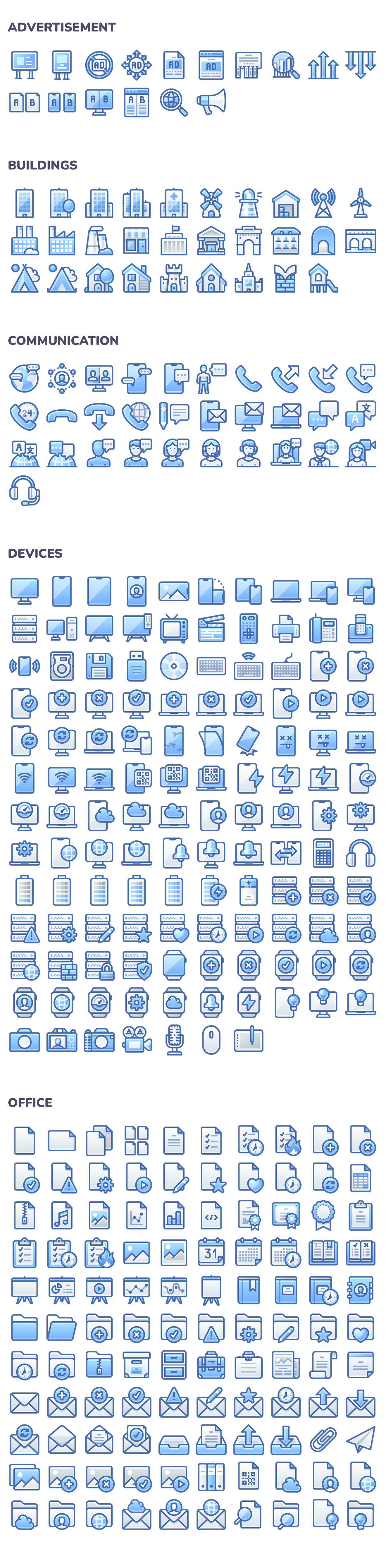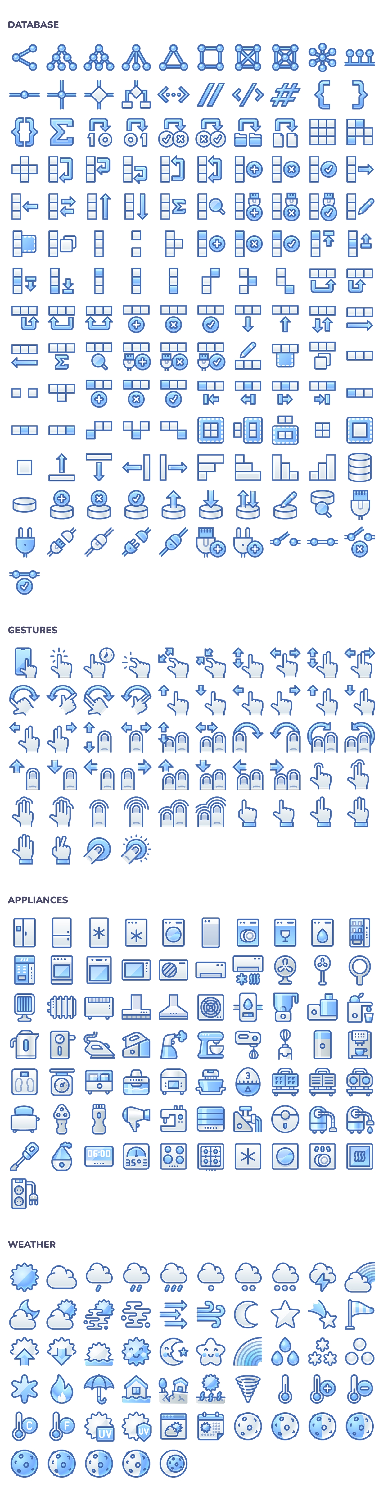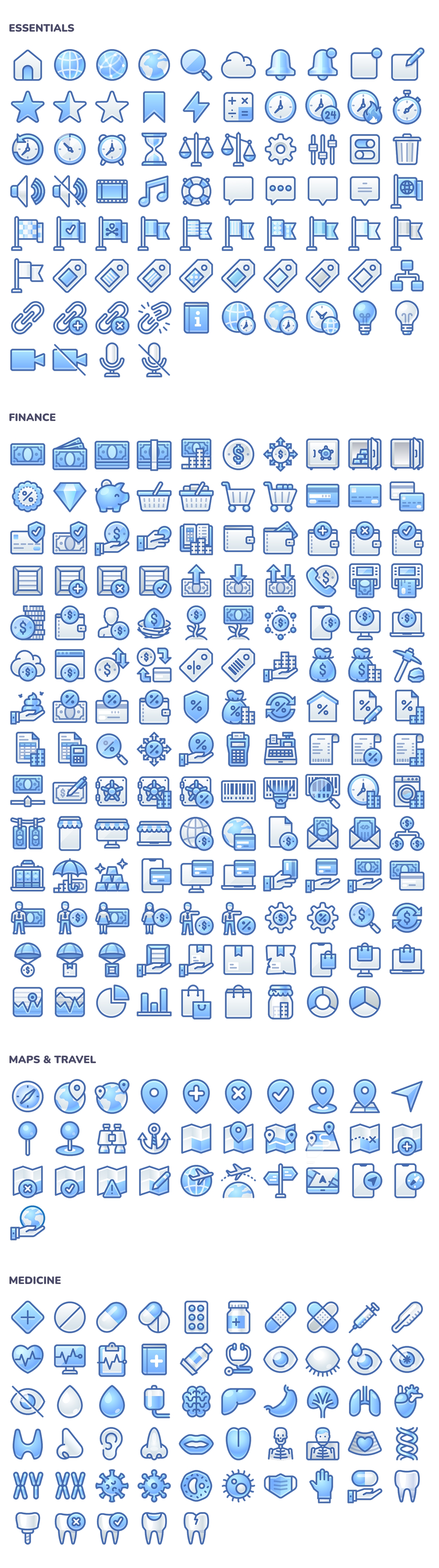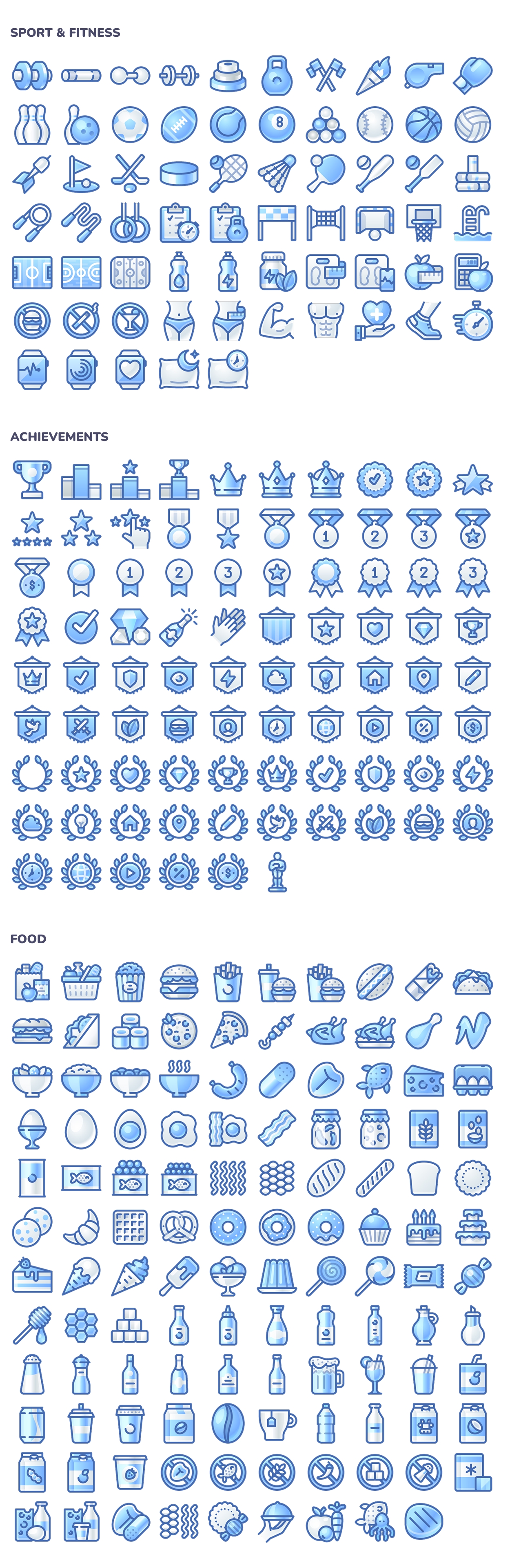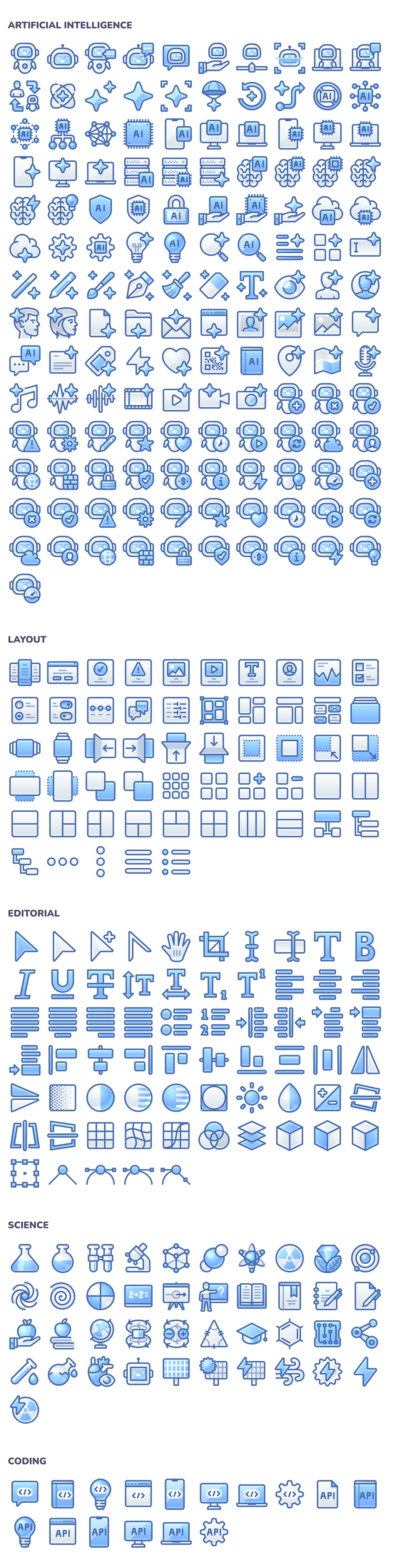 35 icon categories: Achievements, Advertisement, Appliances, Artificial Intelligence, Buildings, Business, Coding, Communication, Christmas, Database, Devices, Editorial, Essentials, Finance, Finance Crypto, Food, Gestures, Halloween, Holiday & Party, Layout, Maps & Travel, Medicine, Nature, Office, People, Romantic, Science, Security, Sport & Fitness, Symbols & Arrows, Technology, Tools, Transport, Weather