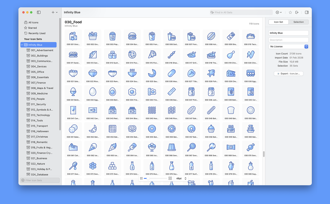 These icons are designed on a 48×48 sized pixel perfect grid to guarantee consistency and crisp look. All files are well structured and organized for better workflow experience.